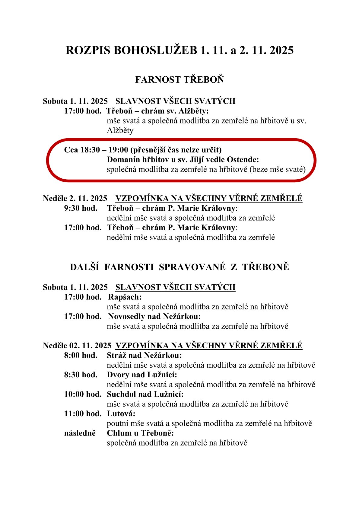 Rozpis bohoslužeb 1. a 2. 11. 2025