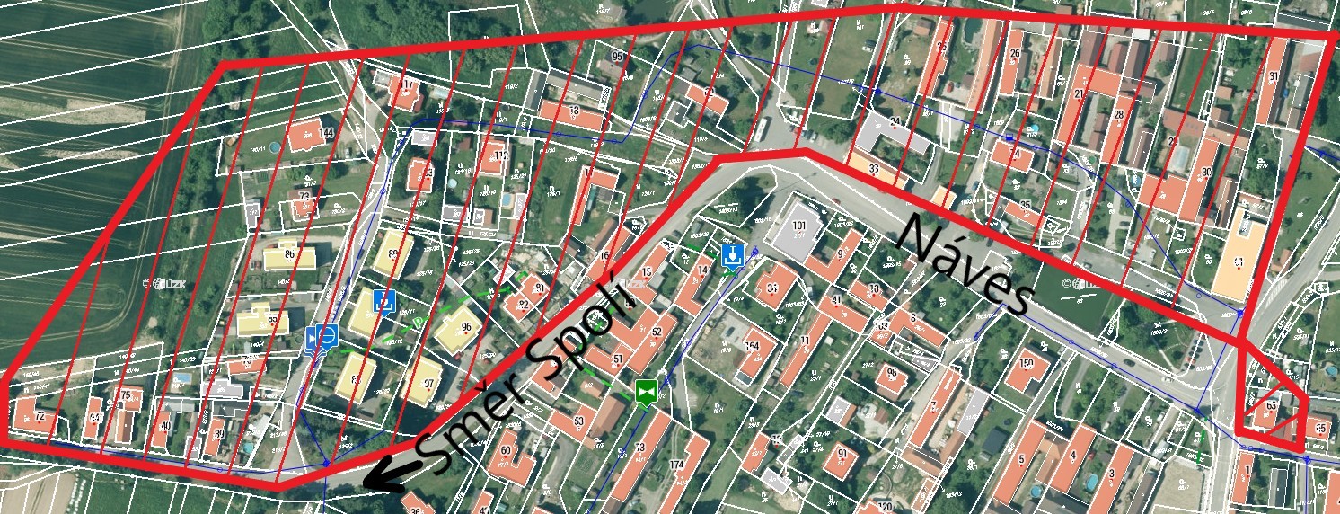 Konkrétně od č. p. 67, pravá část návsi, horní část návsi, pravá strana silnice směr Spolí a ulice u bytovek.