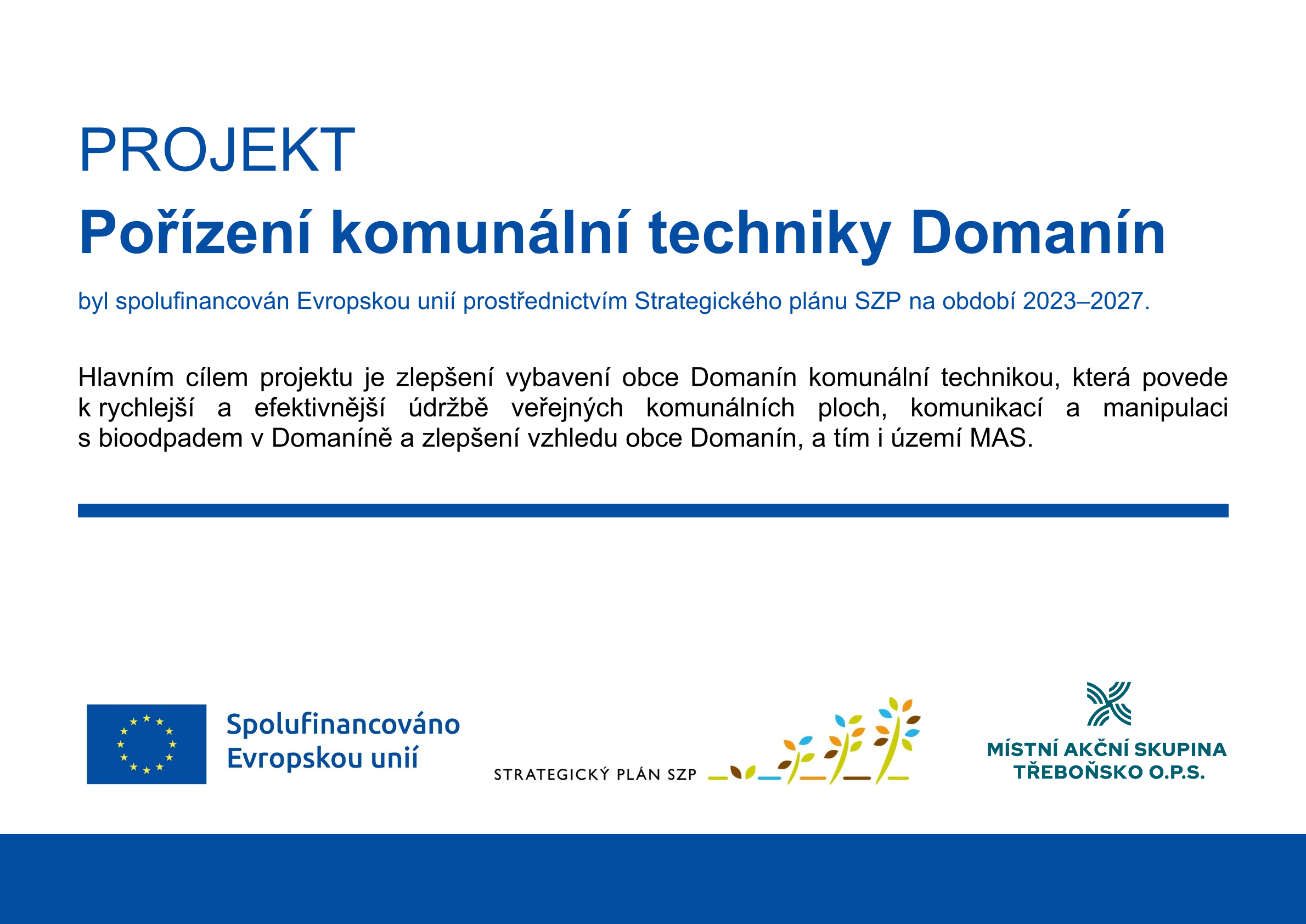 Projekt přispěje k rychlejší a efektivnější údržbě veřejných komunálních ploch a komunikací obce Domanín a manipulaci s bioodpadem, zlepšení vzhledu a image obce Domanín, a tím i území MAS.